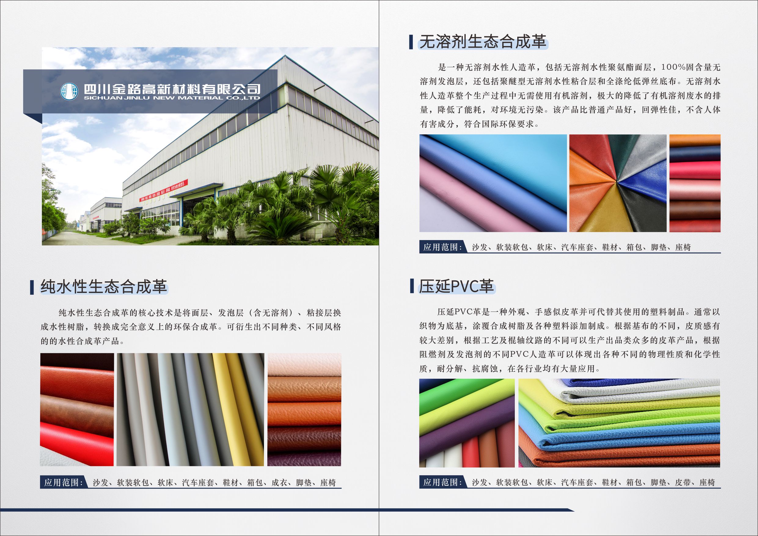 公司产品种类繁多,品质优良,科技时尚、花色品种多样,广泛应用于功能鞋材、沙发家居、电子产品、体育装备、工程装饰、汽车内饰、手袋箱包等领域。产品畅销全国各地,充分满足全球消费者现代生活需求,引领时尚潮流。